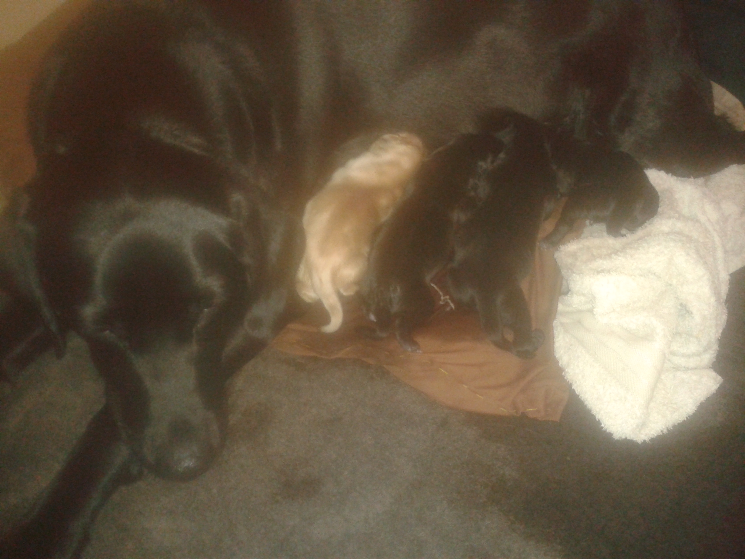 My Labrador bitch Leapatra has just delivered six little black and three yellow Labrador puppies.